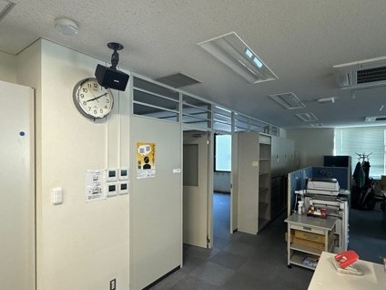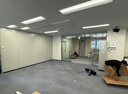 お客様より、同フロア2箇所のパーテーション工事のご依頼を頂きました。片方は、エントランスに入って正面の受付部分にパーテーションを設置して、執務スペースとの間に仕切りを作りたいというご要望。もう一方は、書庫によって塞がれているパーテーションを撤去し、執務フロアを広く使用したいというご要望です。