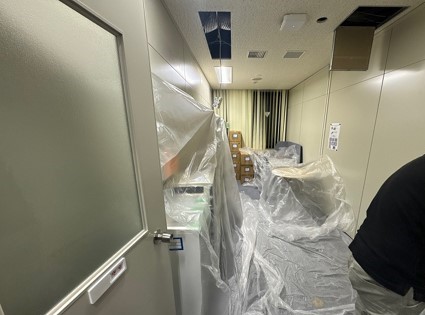 作業の流れとしては、まず解体周辺をしっかり養生したうえで、該当部分の天井を撤去します。