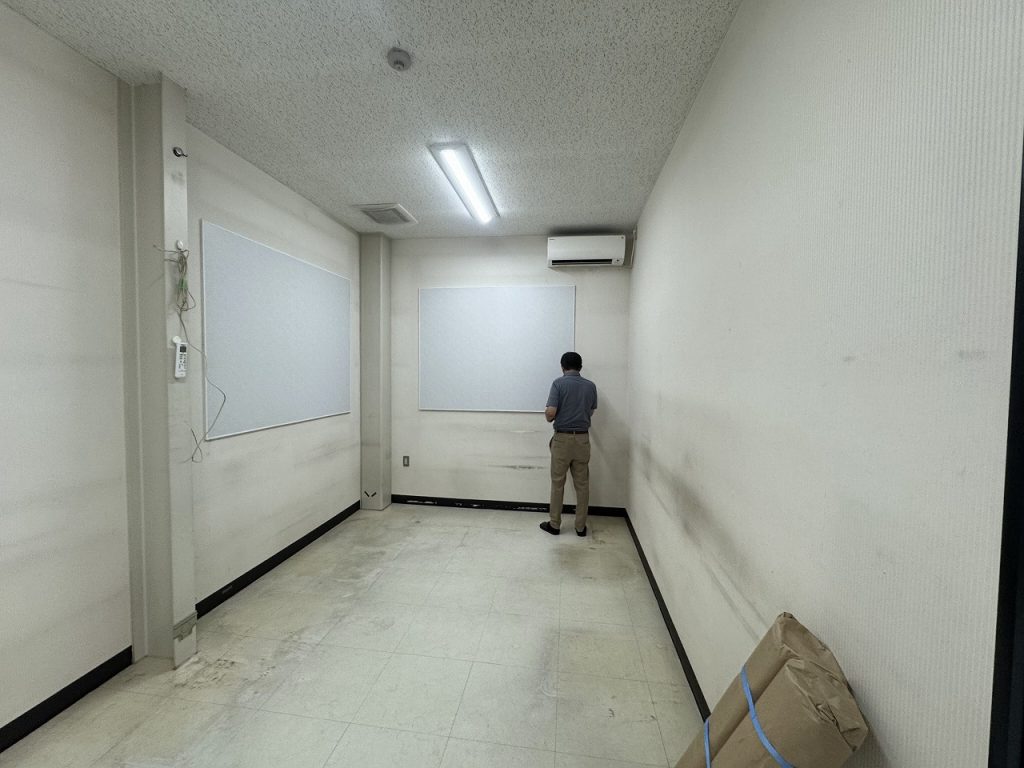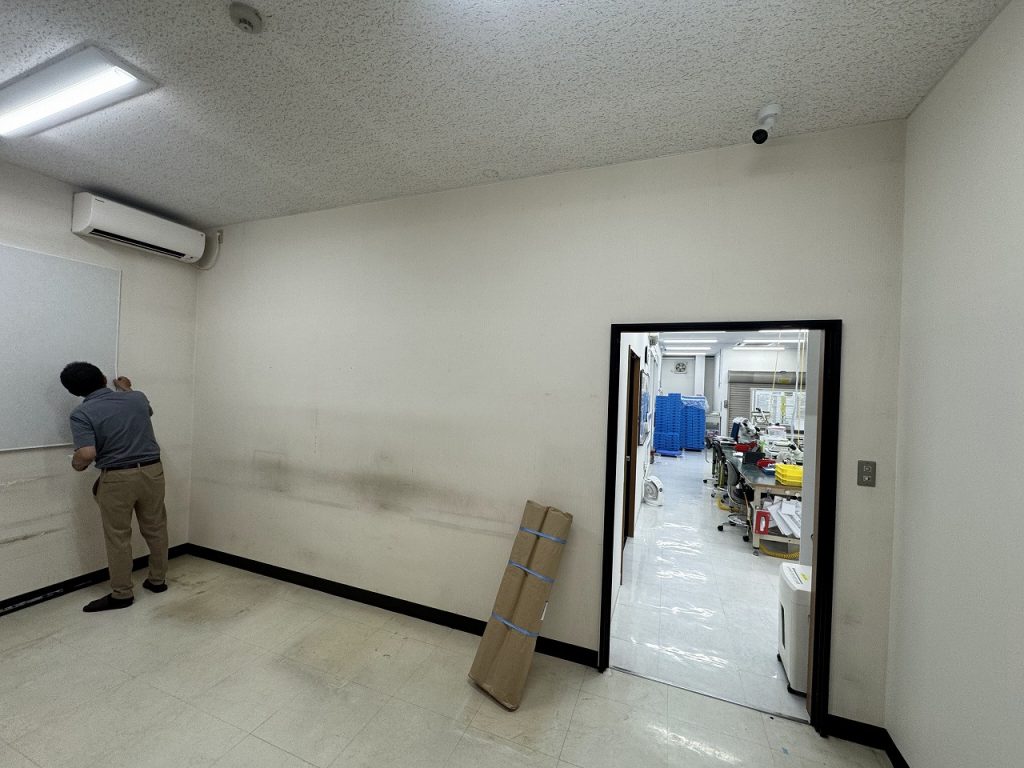デスク・キャビネット・複合機が所狭しと並んでいるため、あまり黒ずみや床の劣化が目立ったように見えませんが、中の物をすべて撤去すると、壁・床の劣化が一目瞭然です。