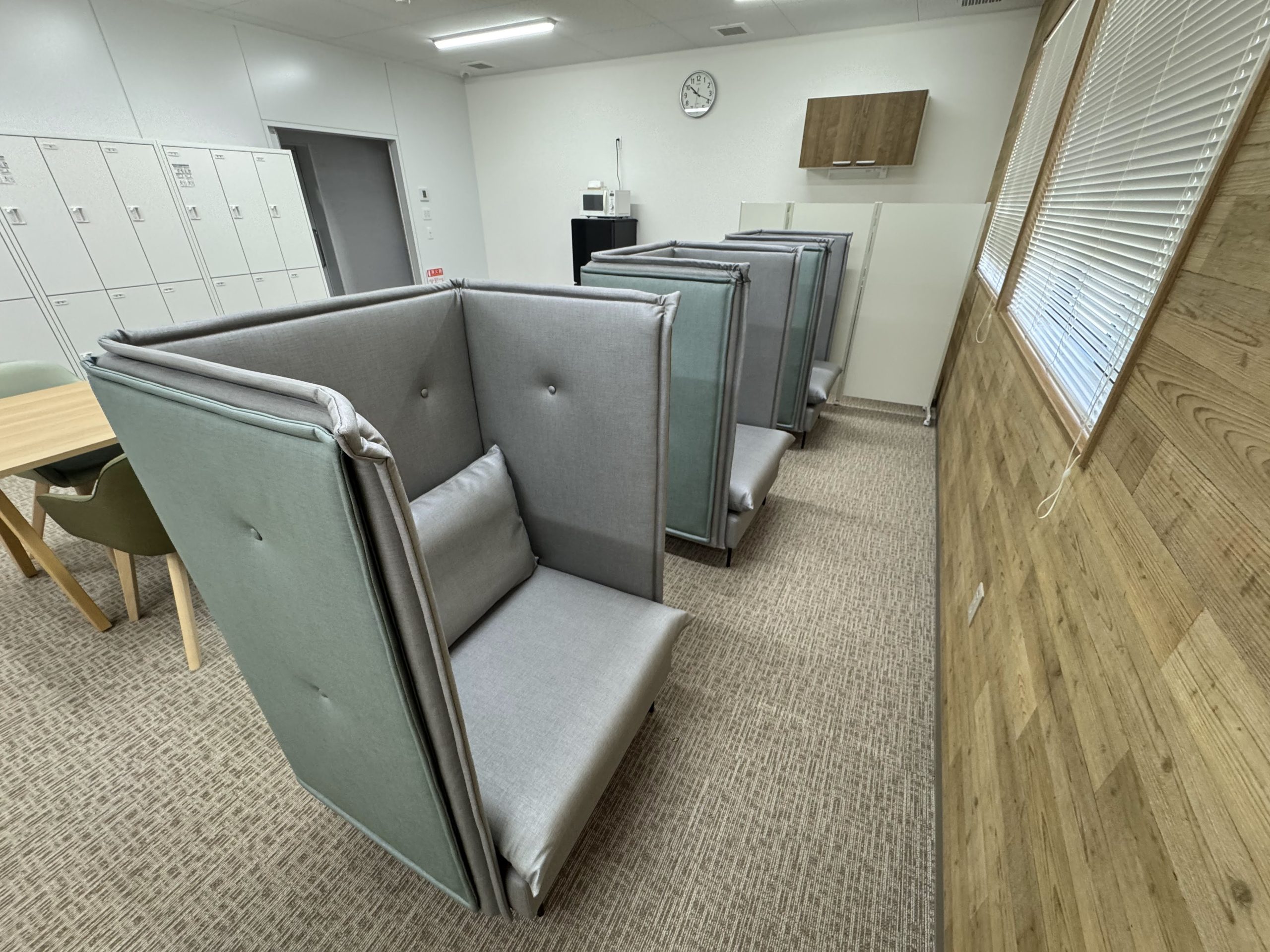 窓際には、1人用のこもれるブースを3台設置。ランチを食べた後、周囲の視線を気にせず、少し仮眠を取ることや、スマホで動画を観たりなど、1人のリラックス時間を楽しむことができます。