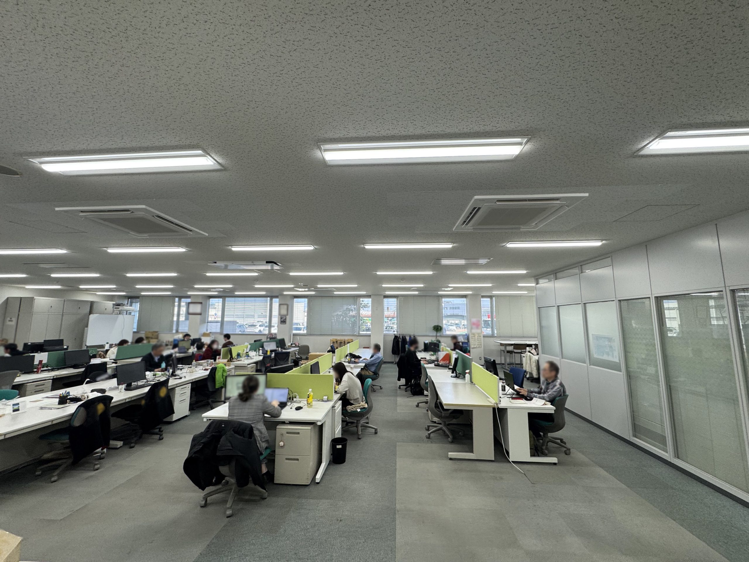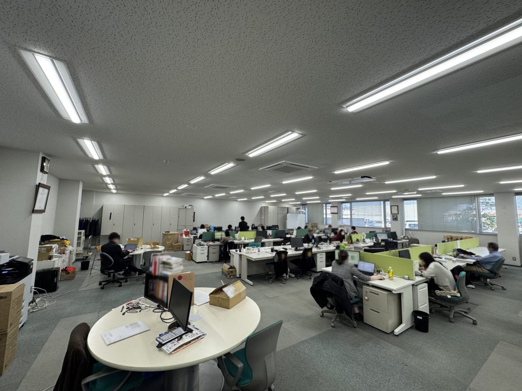 もともと広く開放的な執務室ではありましたが、レイアウトは直線的なデスクが4列に並び、向かい合う席の間に低めのパネルが置かれた、従来型の配置となっていました。写真からも分かるように、家具・什器には経年による古さが感じられる状態でした。