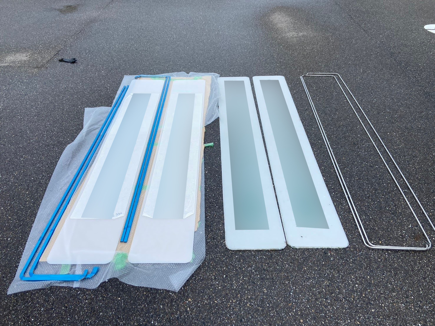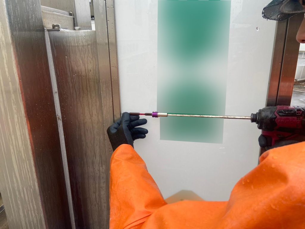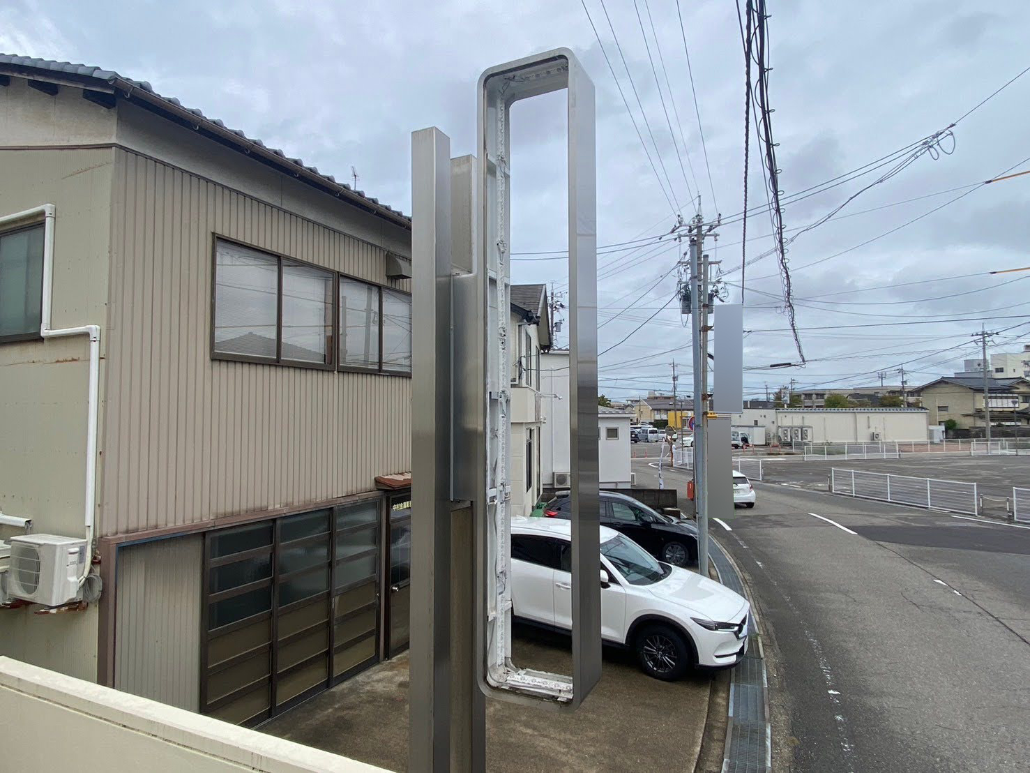 看板の枠に固定されているアクリルの旧看板を外し、新しい看板を取り付けていきます。アクリル看板はウラ・オモテの2枚あります。看板自体は薄いので、ピンと張って、たるみが出ないように固定し、作業は完了です。