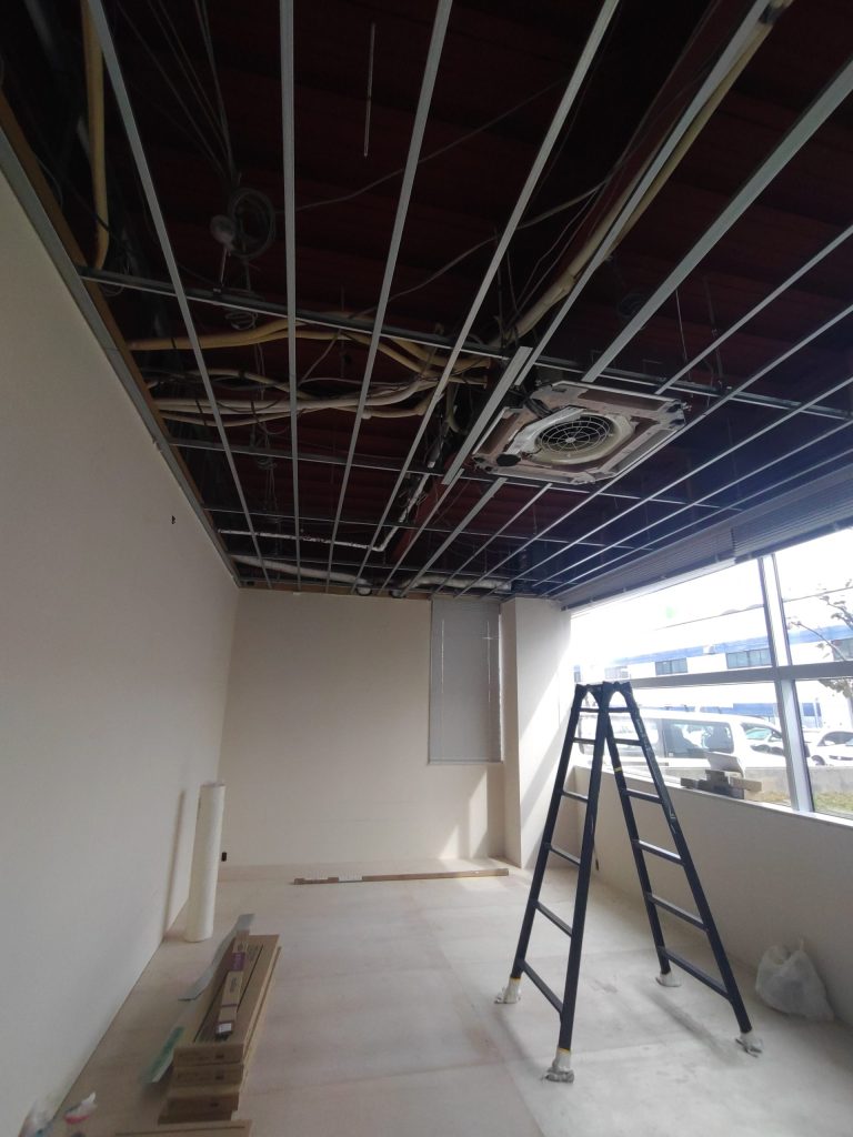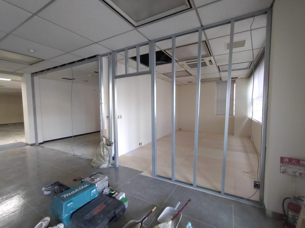 撤去した壁の位置には、軽天**(軽量鉄骨天井下地)で新たに壁とドアの骨格を組み、空間を再構築。