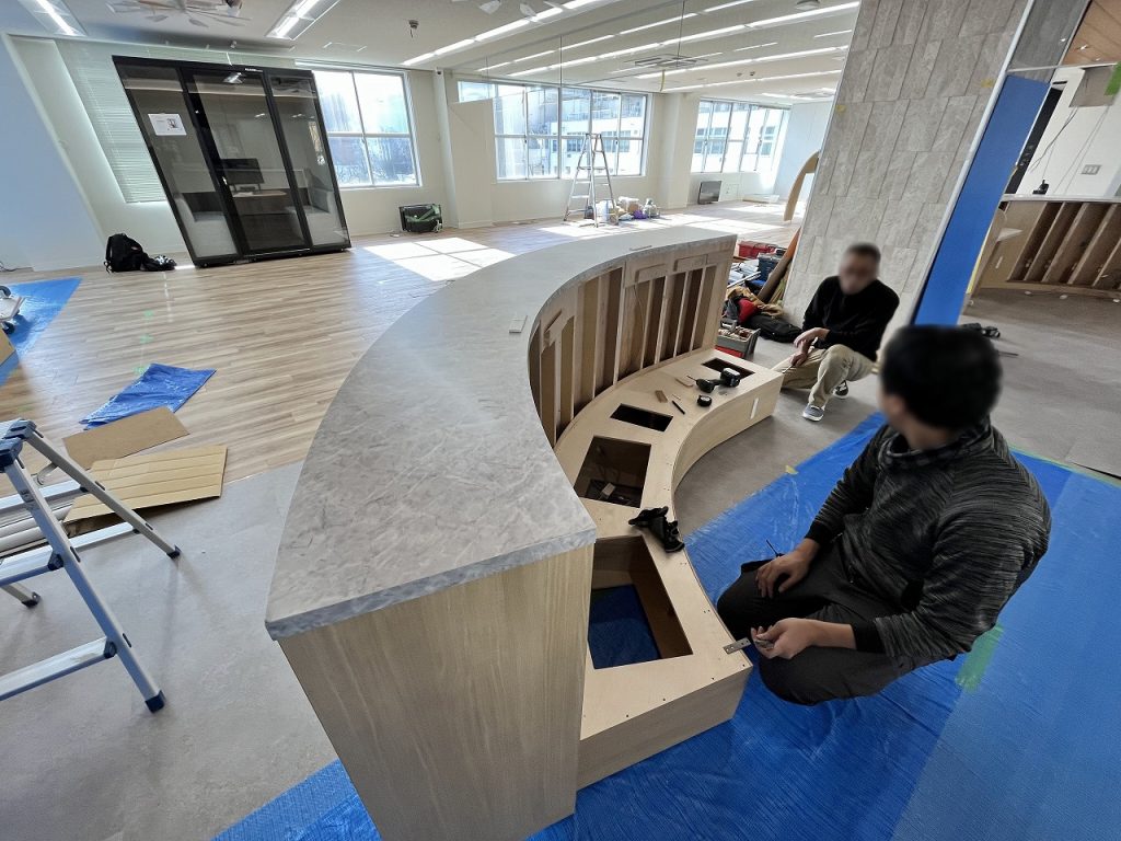 オフィスのリニューアルに伴い、約1,000㎡の広々としたフロアの正面に、社員や来訪者を迎えるオフィスの顔となるカウンターを設置したいとのご要望をいただき、当社デザイナーによる造作カウンターの設計、職人による造作カウンターの製作・設置を行いました。