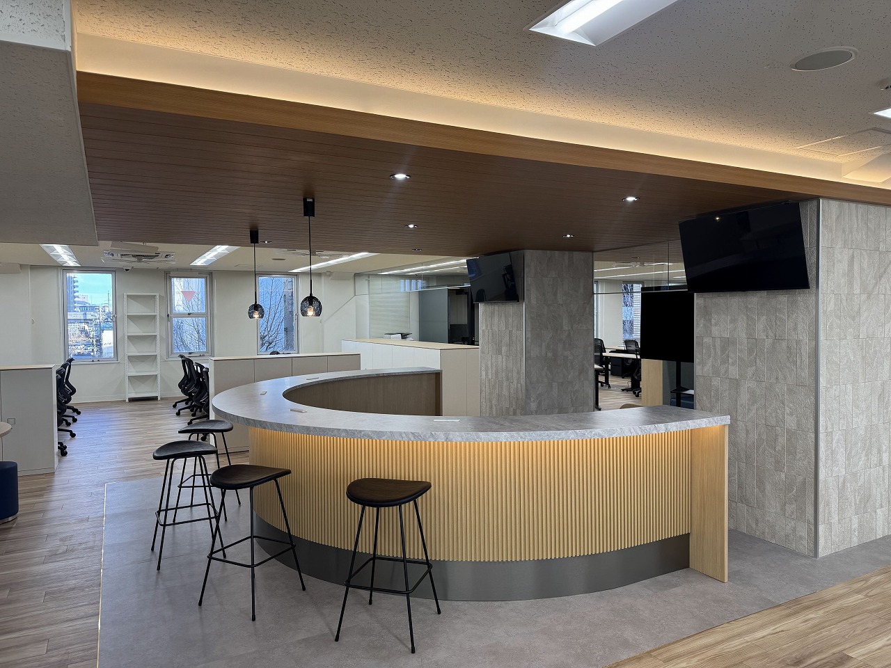 オフィスの中にまるでバーカウンターが現れたかのような、デザイン性の高い造作カウンターテーブルが完成しました。