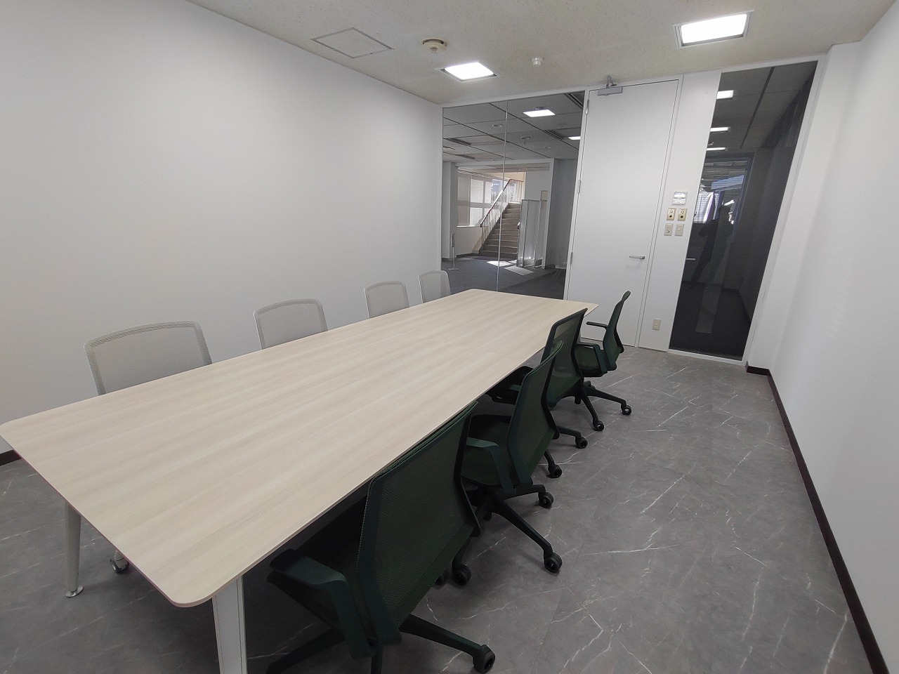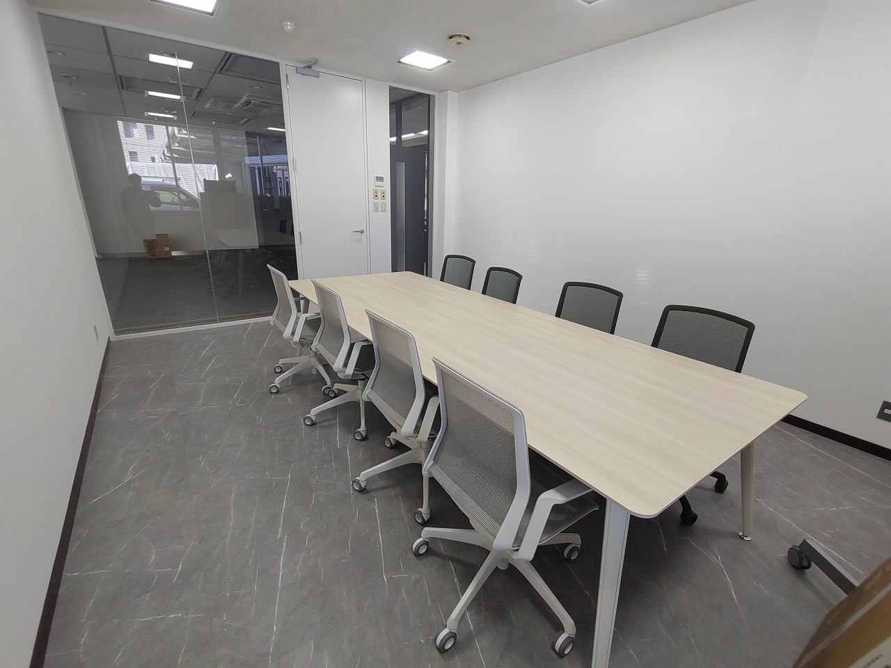 応接セットが置かれていましたが、会議室仕様にするため、8人掛けのテーブルとオフィスチェアを8脚納入させていただきました。